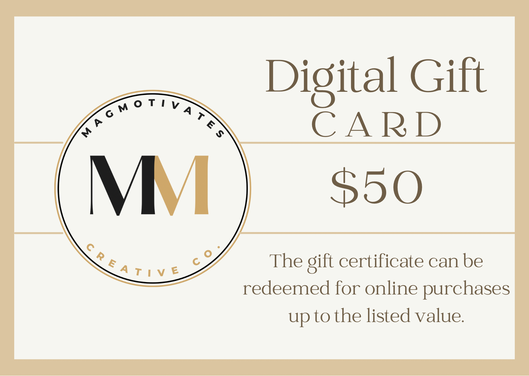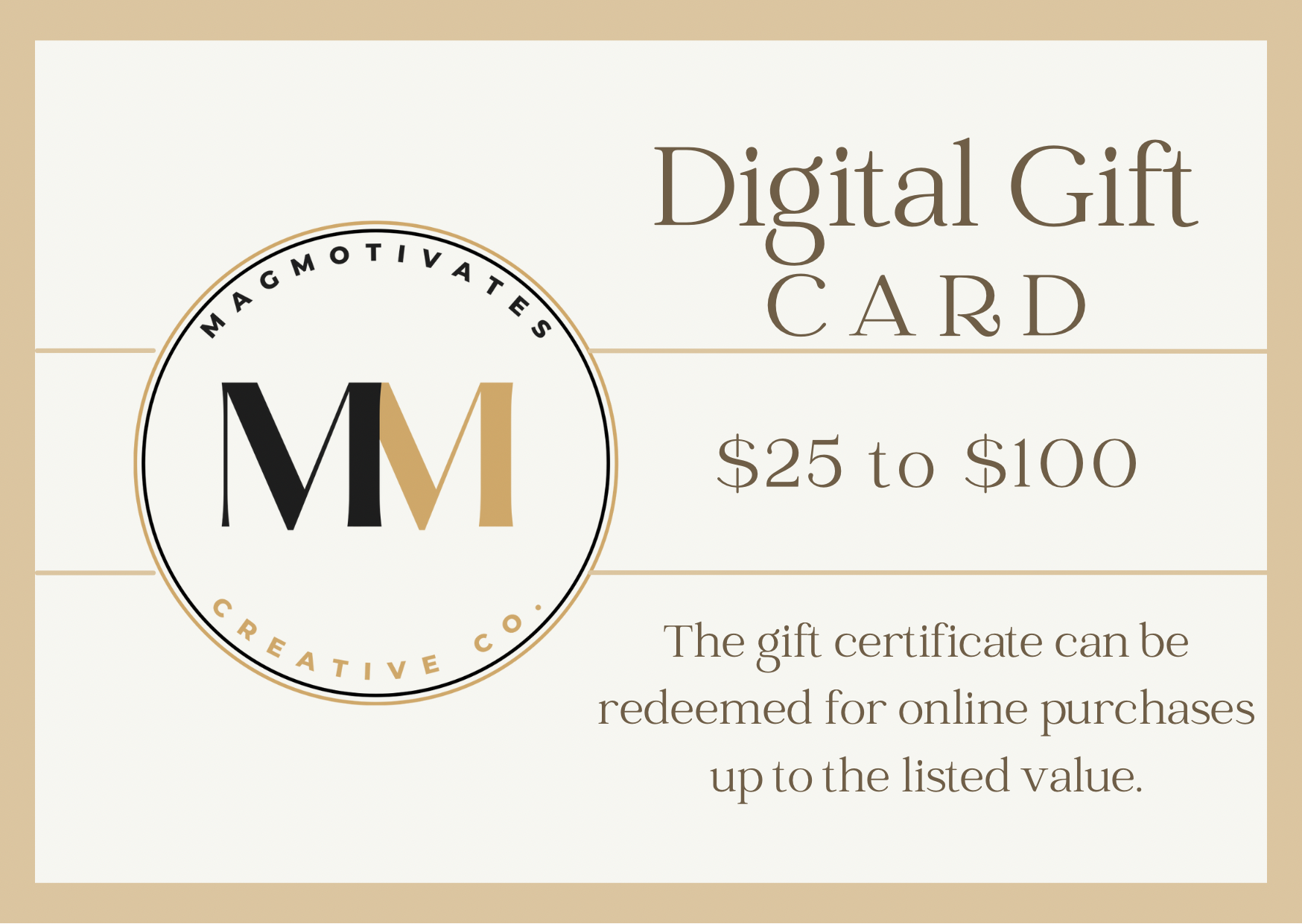 Unlock creativity and inspiration with a digital gift card from MagMotivates Creative Company! Perfect for anyone who needs support, motivation, and positive daily reminders.